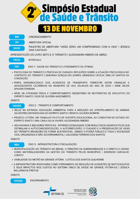 O Departamento Estadual de Trânsito do Espírito Santo (Detran|ES) anuncia a abertura das inscrições para o 2º Simpósio de Saúde e Trânsito, que neste ano aborda o tema "Visão Zero". O Simpósio será realizado no dia 13 de novembro, na sede do Detran|ES, em Vitória. As inscrições são gratuitas e devem ser feitas pelo site www.detran.es.gov.br até o dia 10 de novembro.