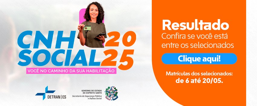 O Departamento Estadual de Trânsito do Espírito Santo (Detran|ES) divulgou, nesta terça-feira (06), a lista dos 3.500 selecionados na primeira fase do programa CNH Social 2025. A relação está disponível no site www.detran.es.gov.br. O beneficiário deve, agora, fazer a matrícula on-line e dar início ao seu processo de Habilitação de forma totalmente gratuita. Confira a lista aqui.