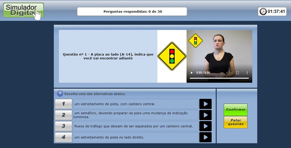 Os simulados são disponibilizados para processos de primeira habilitação, atualização de Carteira Nacional de Habilitação (CNH) e Reciclagem, e têm o mesmo formato das provas de legislação, com 30 questões, quatro alternativas. E agora passam a contar com vídeos em LIBRAS para as perguntas e também para cada uma das alternativas de resposta. No caso do simulado em LIBRAS, o tempo é de 100 minutos para a conclusão do exame.