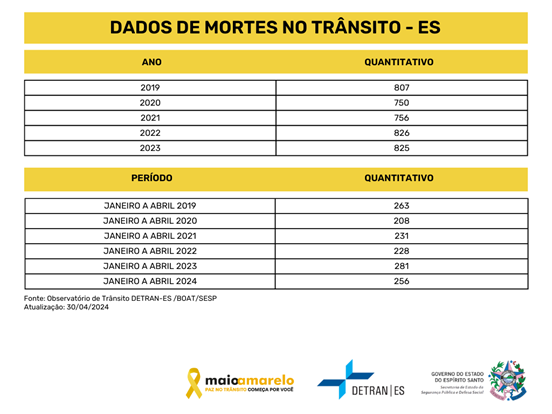 De janeiro a abril de 2024, o trânsito vitimou 256 pessoas. Foram duas mortes por dia em decorrência de sinistros de trânsito. O número ainda é menor do que no mesmo período de 2023, quando 281 pessoas perderam a vida no trânsito capixaba, chegando a 825 mortes em todo o ano de 2023.