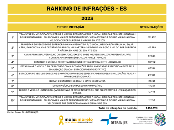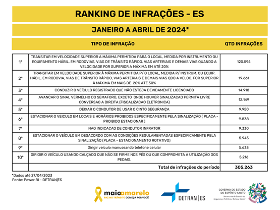 Em relação às infrações previstas no Código de Trânsito Brasileiro (CTB), de janeiro a 27 de abril deste ano, foram 305.263 autuações. No ranking de infrações, transitar em velocidade superior à média permitida para o local é a conduta mais registrada no Estado, o que revela a desobediência de muitos condutores à sinalização de trânsito e aos cuidados essenciais com a segurança.